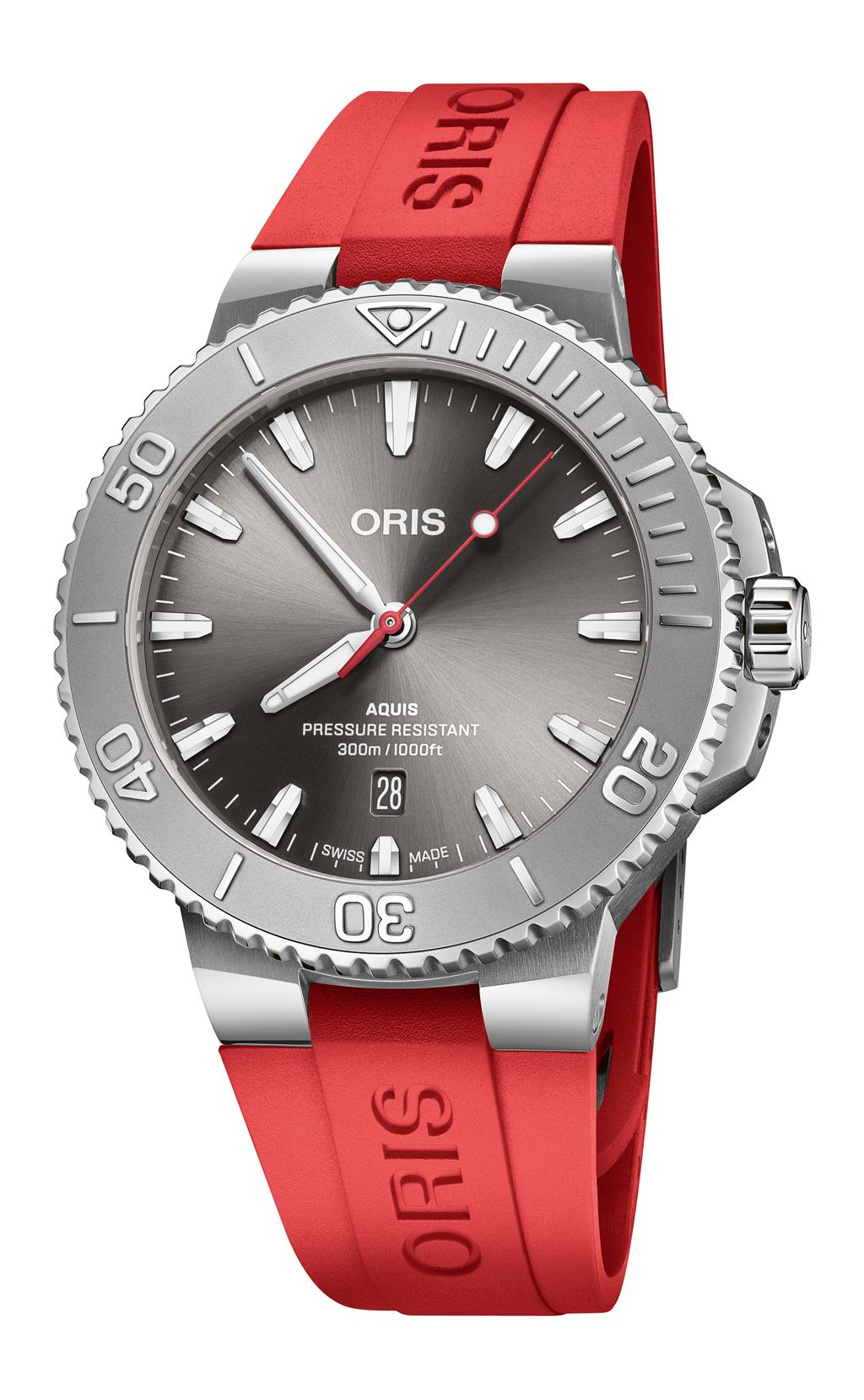 Meet the Aquis Date Relief, a spin on ORIS' high-performing, ultra-versatile Aquis Date. Its special feature is a bezel minutes scale in relief, giving it fresh depth. Note the sunray grey dial and red ‘lollipop’ seconds hand combo, unique to this model. Reference 01 733 7789 4153-07 4 23 36FC
