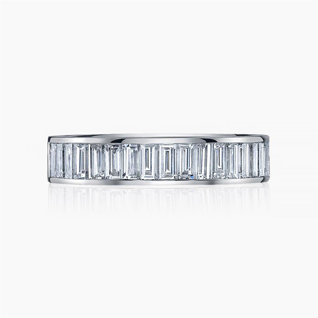 This sophisticated 14k white gold band showcases 20 vertical baguette-cut diamonds channel set in a sleek 3.5 mm design. The diamonds total 0.60 carats, radiating with G/H color and exceptional VS1 clarity for refined sparkle and symmetry. Perfect as a wedding band, anniversary ring, or elegant stacking piece, this timeless design offers a seamless blend of brilliance and craftsmanship. Currently available in size 6, with other sizes available for special order upon request.