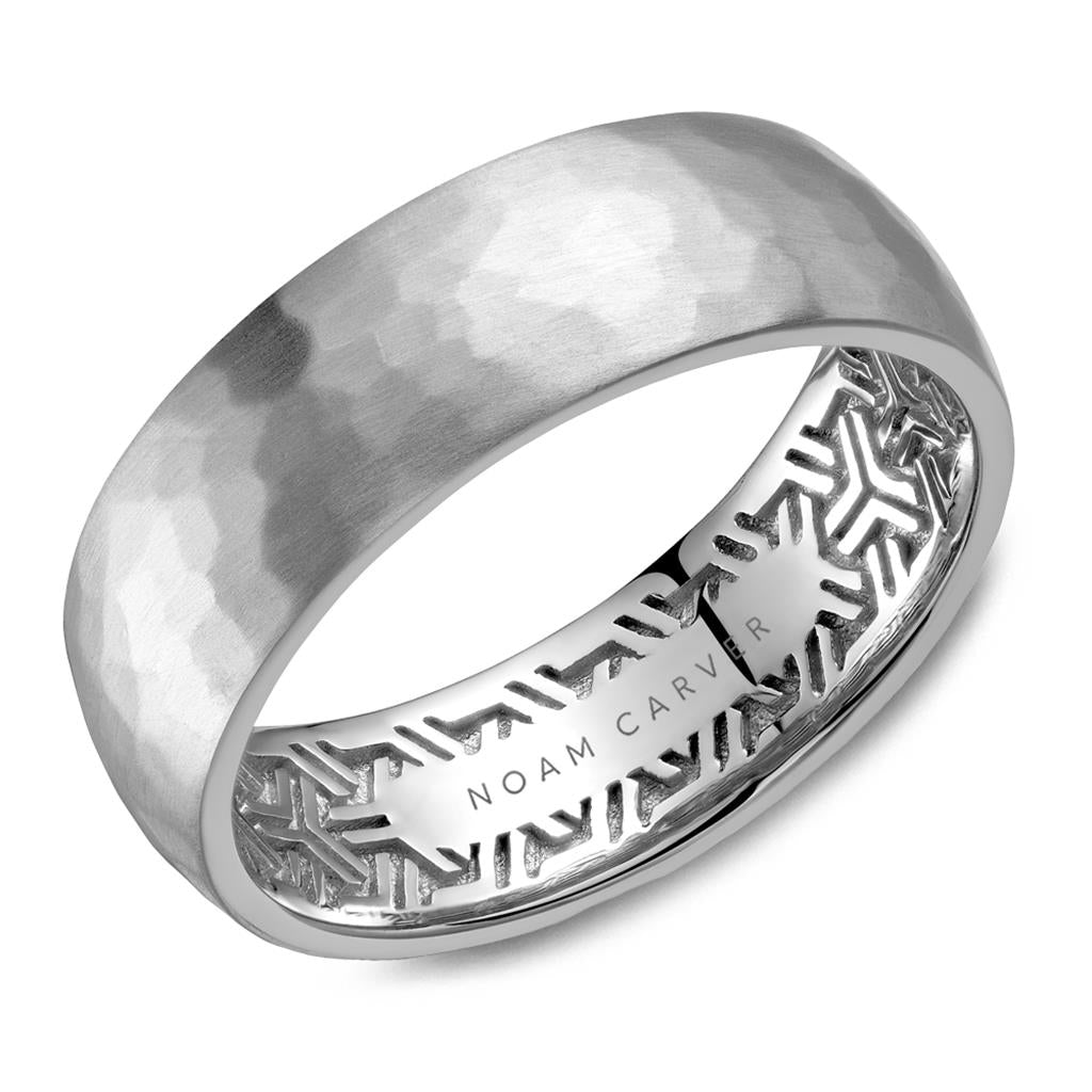Noam Carver 14k White Gold 7.5mm Comfort Fit Wedding Band with Hammered Satin Finish and Egyptian Pattern Interior