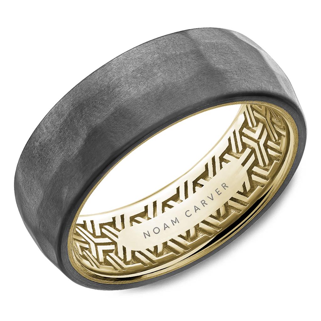 This bold Noam Carver Collection wedding band features a 7.5mm comfort fit design crafted in grey tantalum with a distinctive frosted hammered finish. The interior reveals a luxurious 14k yellow gold Egyptian pattern, offering an elegant contrast and hidden detail. This modern and sophisticated band is a perfect symbol of strength and commitment. Available in size 10, with other sizes available upon request.