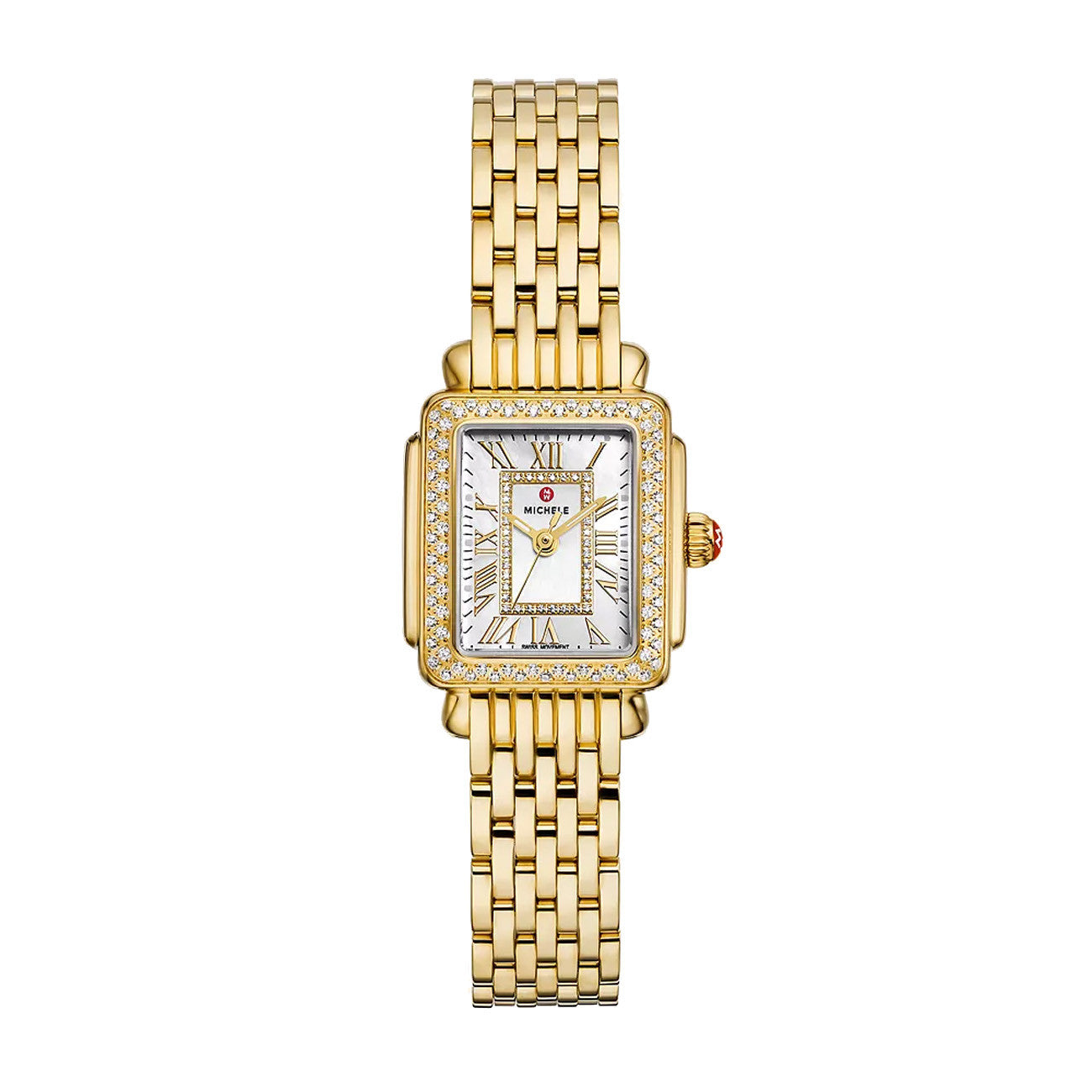 This petite 18K gold-plated rectangular timepiece perfectly balances vintage-inspired style with a modern edge. The white mother-of-pearl dial shines with 122 diamond accents (0.43 carat weight) and Swiss movement. The 18K gold plated bracelet is made specifically for the Deco Madison Mini collection and is interchangeable with any 12mm MICHELE strap. Reference MWW06D000173