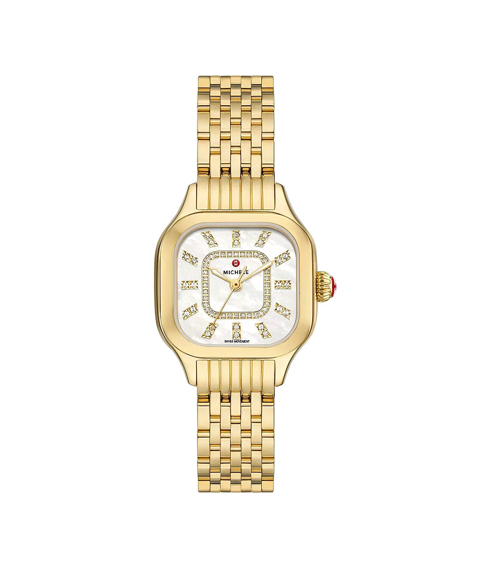 Elegant curves add modern elegance to the case of MICHELE's stunning Meggie watch that sparkles with 60 hand-set diamonds (0.19 carat weight) on the mother-of-pearl dial with diamond inner ring and double diamond indexes. This watch features a Swiss movement and a gleaming 14mm seven-link 18K gold-plated seven-link bracelet made specifically for the Meggie collection interchangeable with any 14mm MICHELE strap. Reference MWW33B000010.