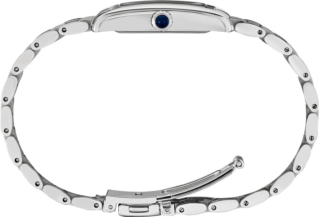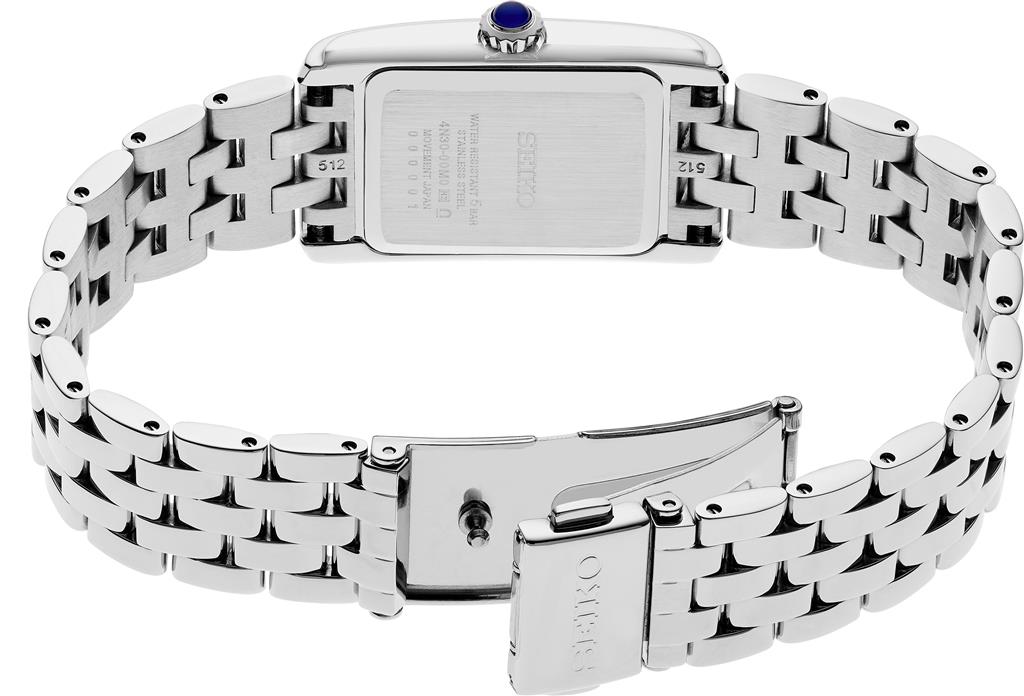 From the Essentials Collection. A sophisticated classic, perfectly proportioned for a jewelry-like feel, this elegant rectangular case watch offers a patterned blue Roman numeral dial, silver hands and markers, and a blue cabochon crown. Crafted of stainless steel, this graceful design includes a five-row stainless steel bracelet for sleek wearing comfort, and a tri-fold push button release clasp. 5 bar, 50m Water Resistant. Reference SWR085