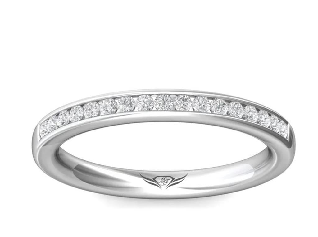 This refined 14k white gold FlyerFit diamond band features 17 channel-set round brilliant-cut diamonds, totaling 0.26 carats. With H color and SI2 clarity, these diamonds create a continuous line of sparkle along the band, perfect for stacking or wearing alone as a timeless piece. Available in size 6.5, with other sizes available upon request.