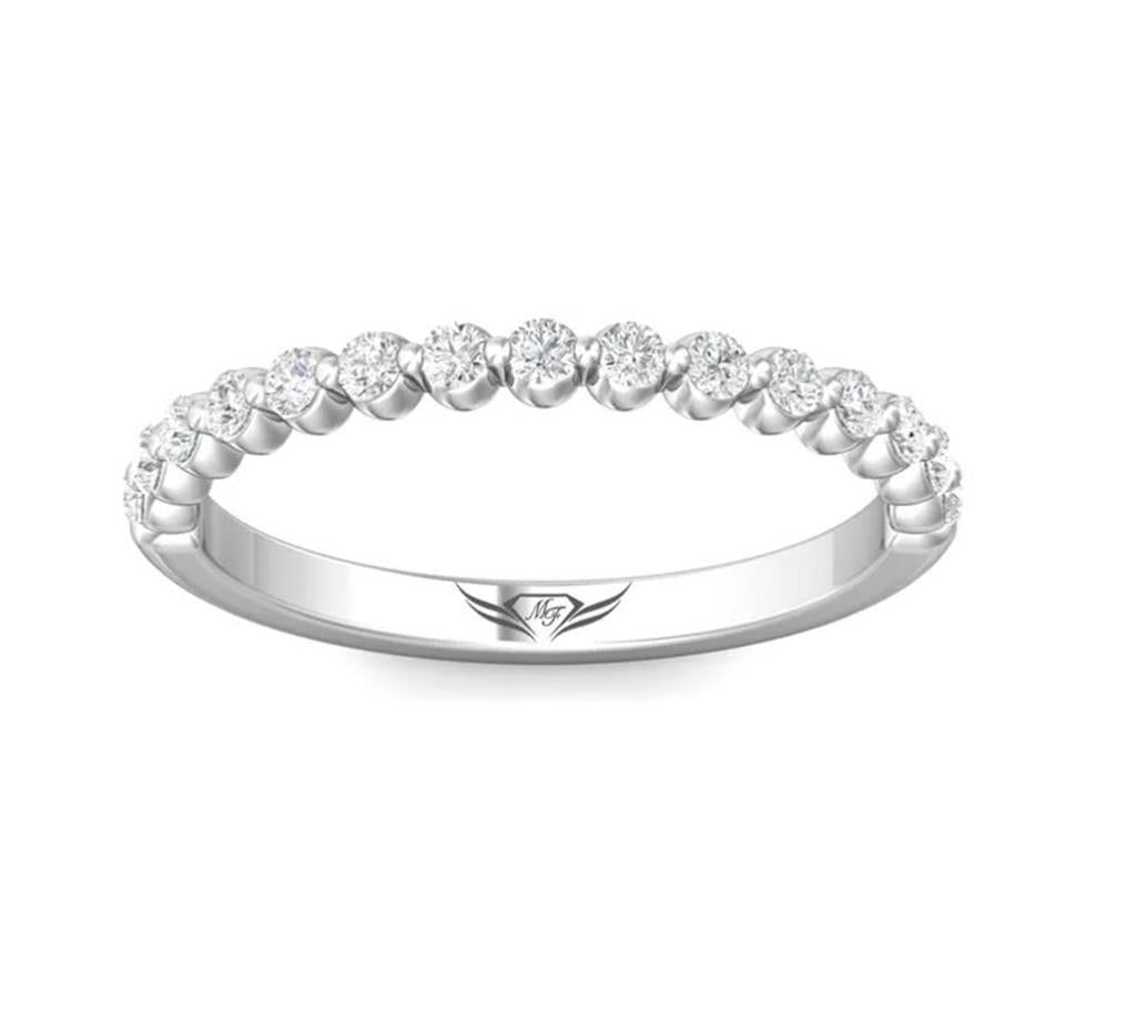 This elegant 14k white gold FlyerFit diamond band features 15 shared single prong-set round brilliant-cut diamonds, totaling 0.33 carats. With H color and SI2 clarity, these diamonds bring a delicate sparkle, perfect for stacking, pairing with an engagement ring, or wearing alone as a timeless piece. Available in size 6.5, with other sizes available upon request.