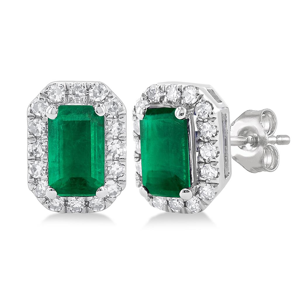 Radiating timeless elegance, these Davis Signature 14k white gold stud earrings feature two prong-set emerald-cut natural emeralds measuring 5 x 3mm, framed by a halo of 32 prong-set round single-cut diamonds totaling 0.13 carats, with I/J color and I1-I2 clarity. Secured with friction post backs, this enchanting design is a luxurious celebration of vibrant beauty and refinement.