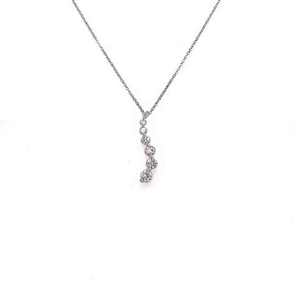 Crafted in 14k white gold, this Davis Signature journey pendant showcases a beautiful progression of seven graduated round brilliant cut diamonds, elegantly single-prong set to emphasize each stone’s sparkle. With a total weight of 1.07 carats and graded G/H color, SI1 clarity, these diamonds add a captivating elegance. The pendant is suspended on an adjustable 16-18 inch cable chain with a secure lobster clasp, making it a versatile and timeless addition to any jewelry collection.