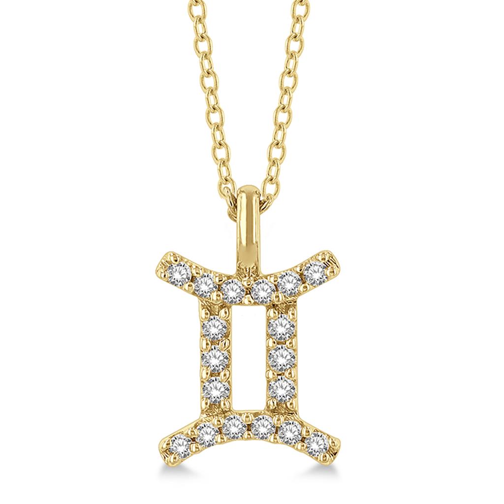This enchanting Davis Classics 14k yellow gold zodiac necklace features a Gemini-inspired design adorned with 18 prong-set round single-cut diamonds, totaling 0.08 carats, with I/J color and I1/I2 clarity. Suspended on an adjustable 16-18" cable chain and secured with a spring ring clasp, this necklace is a perfect blend of celestial charm and subtle sparkle, ideal for celebrating your astrological sign.