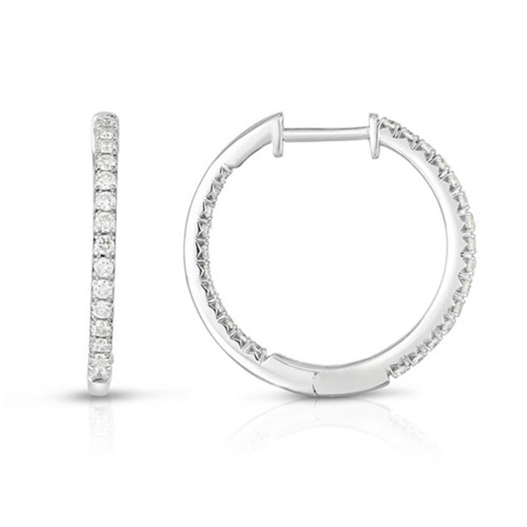 These sophisticated 14k white gold hoop earrings feature a 3/4-inch in/out design set with 28 prong-set round brilliant-cut diamonds totaling 1.00 carats. The diamonds sparkle with I/J color and SI1–SI2 clarity, creating radiant brilliance along both the inner and outer curves. Finished with secure locking lever backs, these hoops offer timeless elegance and versatile shine—perfect for elevating any look with refined sparkle.