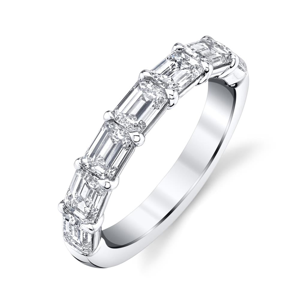 This elegant Davis Classics platinum diamond band features 8 East/West shared prong set emerald cut diamonds, each measuring 4 x 2.7mm, for a total diamond weight of 1.51 carats. The diamonds are of G/H color and VS1 clarity, showcasing exceptional brilliance and sophistication. Perfect for celebrating timeless elegance, this band is ideal as a wedding band or a statement piece. Available in size 6, with additional sizes upon request, this ring is a refined expression of enduring style and craftsmanship.