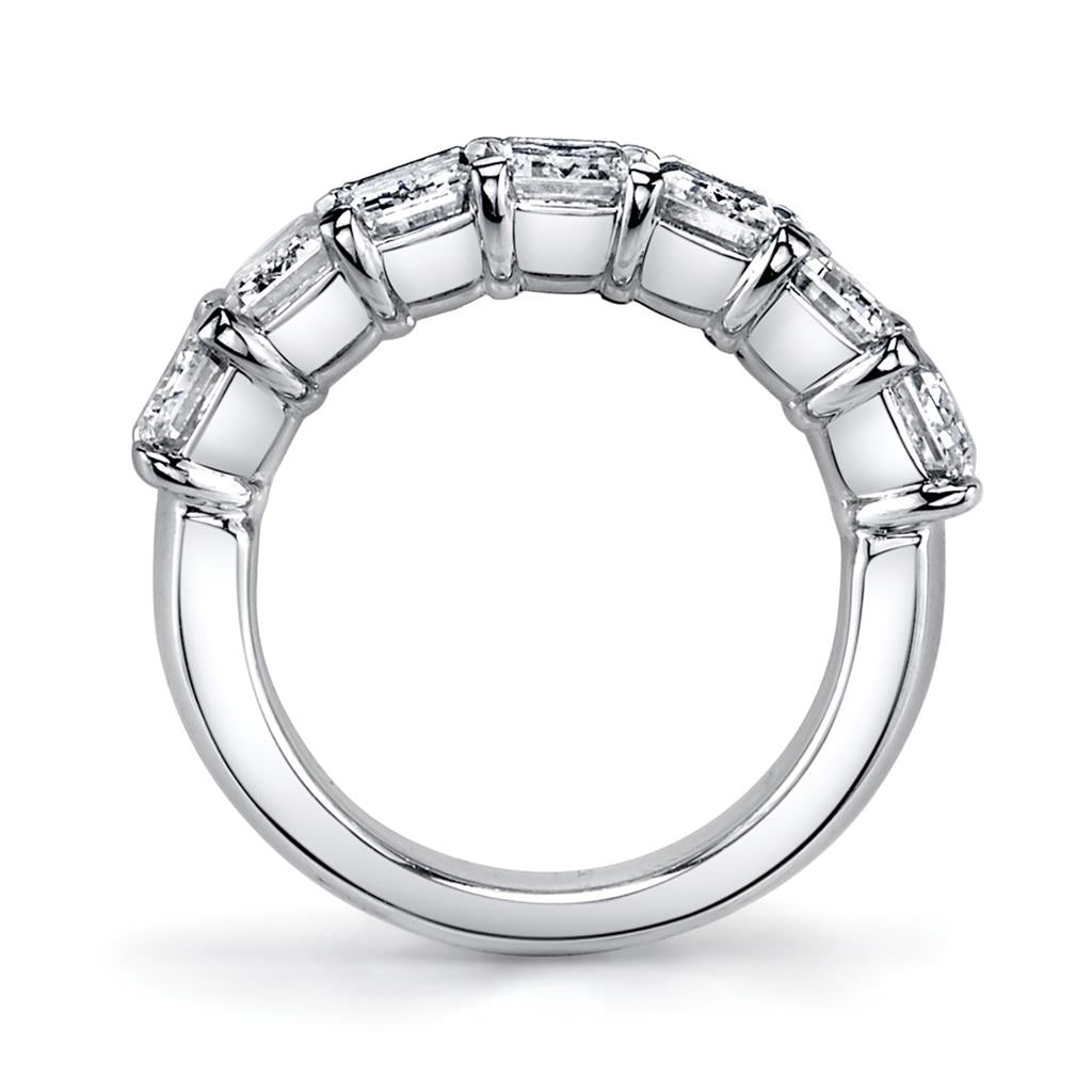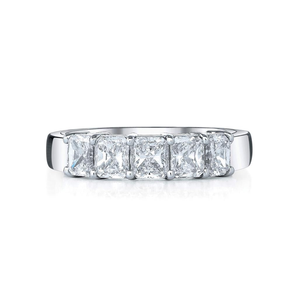 This stunning platinum diamond band features five radiant-cut diamonds in a North/South shared prong basket setting, totaling 2.50 carats. With H color and SI1 clarity, these radiant diamonds create a captivating sparkle, making this band an elegant choice for any occasion. Perfect for wearing alone or pairing with other pieces, it is available in size 6, with other sizes available upon request.