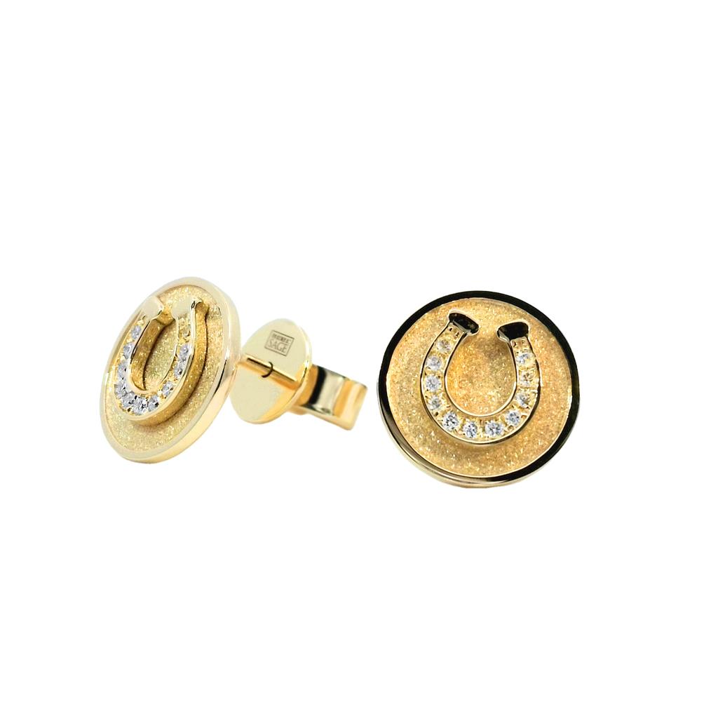 Embrace the elegance of the Frederic Sage Happy Collection with these exquisite 14k yellow gold diamond horseshoe stud earrings. Each 10mm disc features a delicate horseshoe design, adorned with 22 prong-set round brilliant-cut diamonds, totaling 0.08ctw, with an F/G color and VS2-SI1 clarity. The satin finish adds a soft, luxurious touch, while the friction post backs ensure a secure and comfortable fit. These stunning earrings are a perfect blend of timeless beauty and modern sophistication, ideal for adding a touch of luck and sparkle to any outfit.