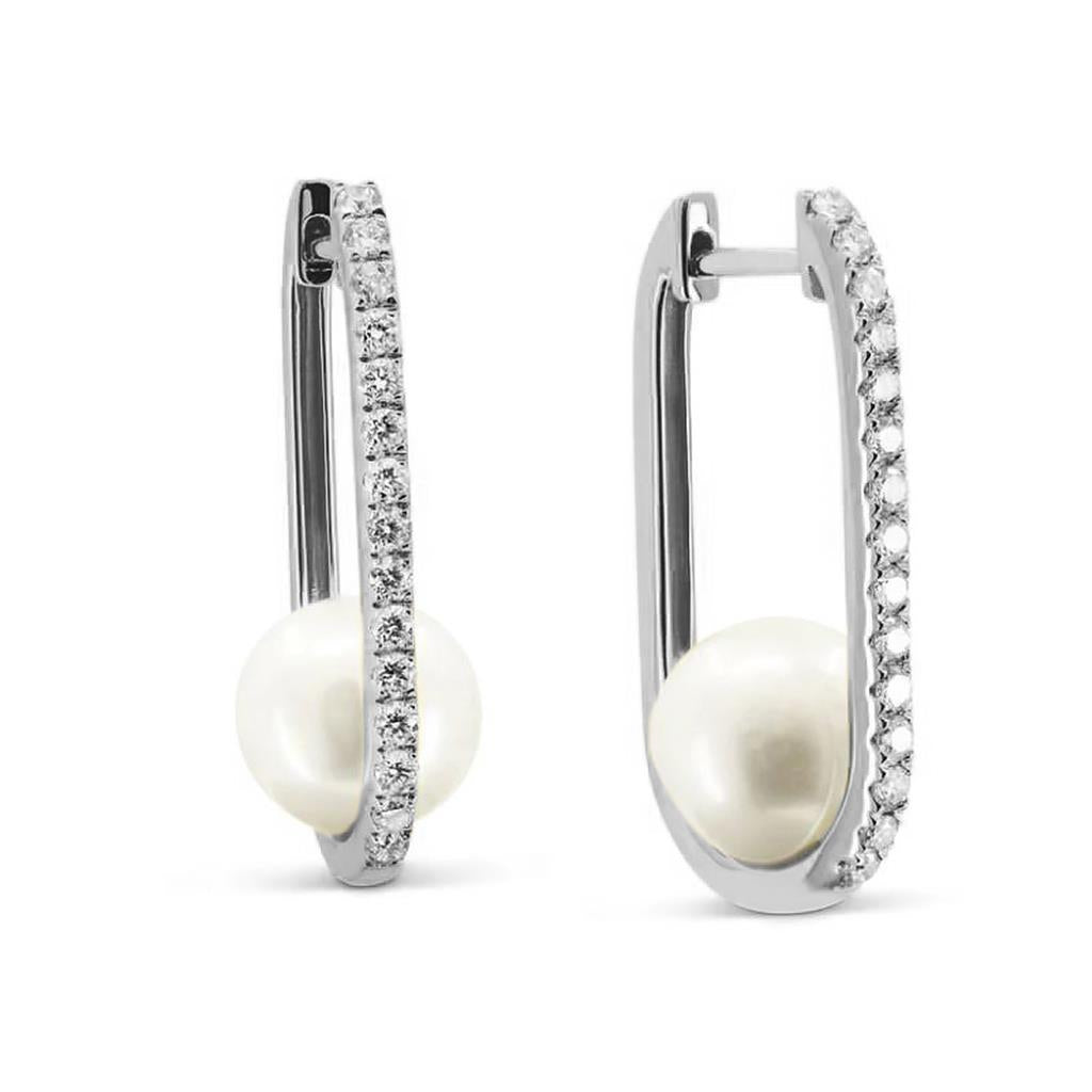 Elevate your elegance with the Madison L 14k White Gold Pearl and Diamond Hoop Earrings. Each earring features two luminous white cultured freshwater pearls, measuring 7.5mm, complemented by 30 prong set round brilliant cut diamonds totaling 0.36 carats, with G/H color and SI2 clarity. The combination of lustrous pearls and sparkling diamonds creates a classic yet contemporary look. Finished with secure locking full closure clasps, these hoops offer both sophistication and comfort.