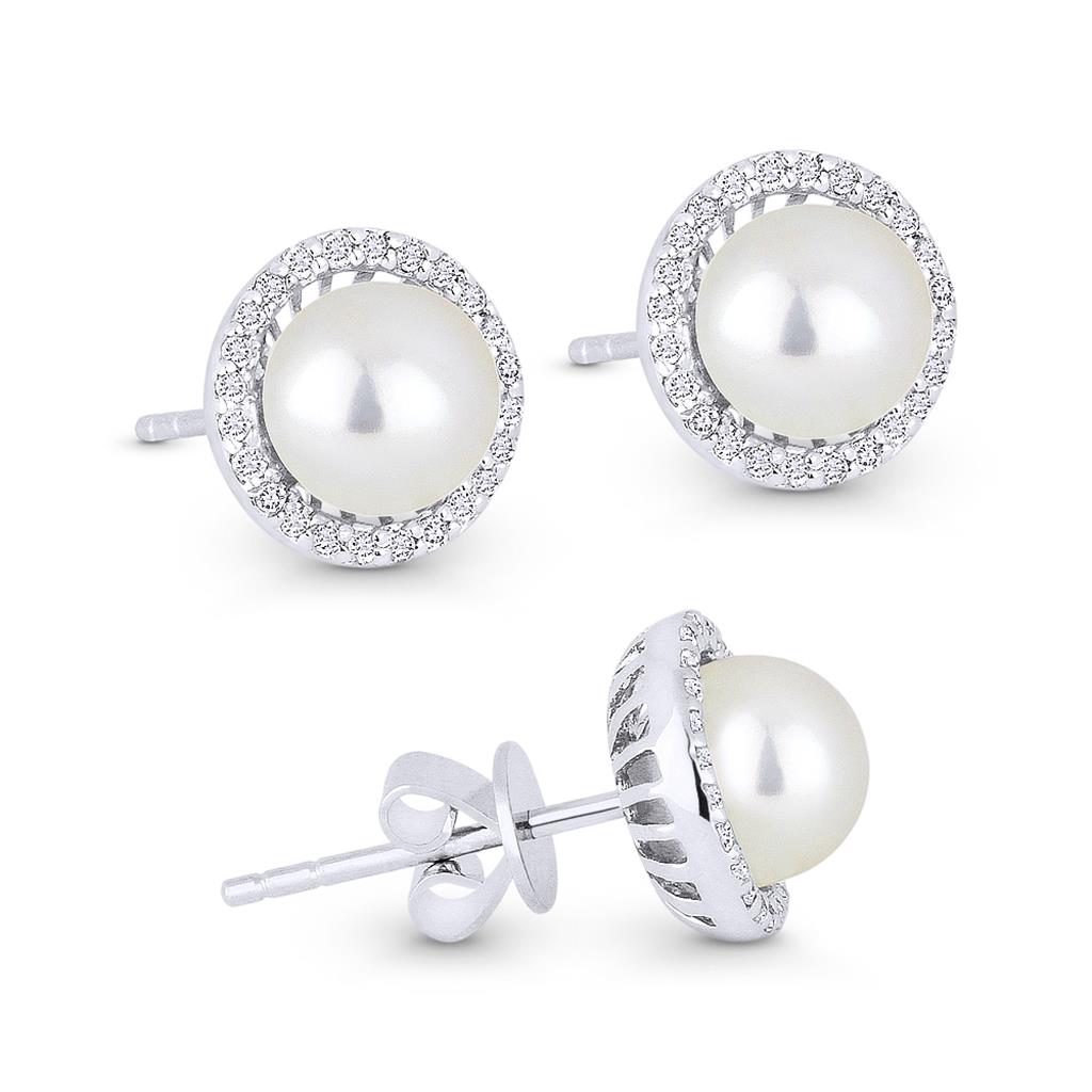 Indulge in the classic sophistication of the Madison L 14k White Gold Pearl Halo Stud Earrings. Each earring features a lustrous 6mm white cultured freshwater pearl, embraced by a radiant halo of 48 prong-set single cut diamonds, totaling 0.16 carats with G/H color and SI2 clarity. The friction posts and backs ensure a secure and comfortable fit. These timeless earrings add a touch of elegance to any outfit, making them a perfect choice for everyday wear and special occasions.