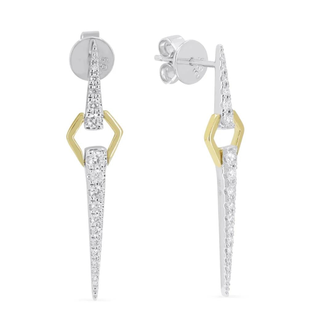 From the Milano Collection by Madison L, these striking dangle earrings are crafted in 14k white and yellow gold and feature a sleek spear design adorned with 34 prong-set round brilliant cut diamonds totaling 0.37 carats, graded G/H color and SI1–SI2 clarity. Finished with secure friction post backs, they offer a refined balance of modern elegance and radiant sparkle.