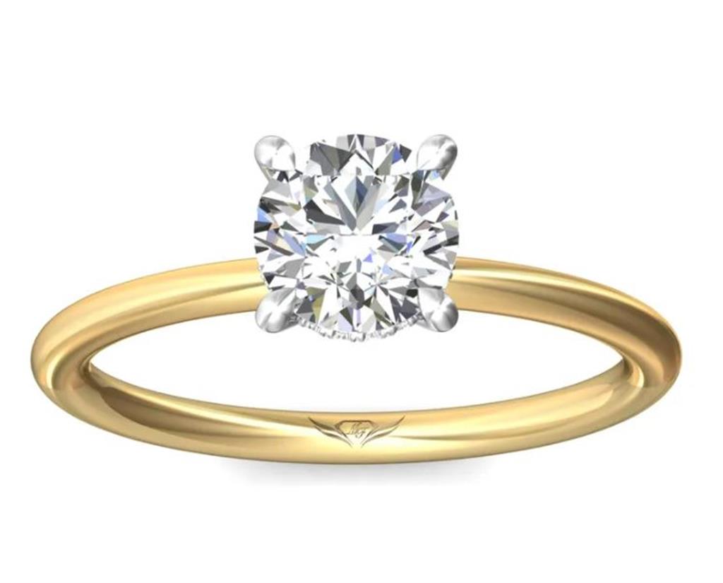This refined 14k yellow gold solitaire engagement ring setting by Martin Flyer showcases a hidden halo of 20 prong-set round brilliant cut diamonds totaling 0.06 carats, with H color and SI2 clarity, adding a subtle sparkle to highlight the center stone. Designed to hold an 8mm round brilliant cut center stone in a 14k white gold head, this setting offers a timeless elegance. Available in finger size 6.5, with other sizes available upon request. Please note that the price is subject to change based on finger size and metal preference. The price does not include the center stone.